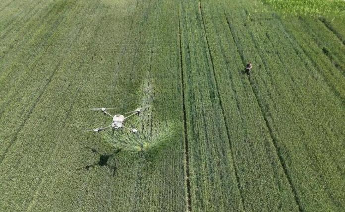 即墨區(qū)段泊嵐鎮(zhèn)的后寨村,連片的小麥長勢喜人,田野一片蔥綠,無人機在麥田上空低空勻速飛行,忙碌穿梭在縱橫交錯的田野間。伴隨著陣陣轟鳴聲,載滿農(nóng)藥的植保無人機平穩(wěn)飛行,均勻地向田間噴灑著農(nóng)藥。