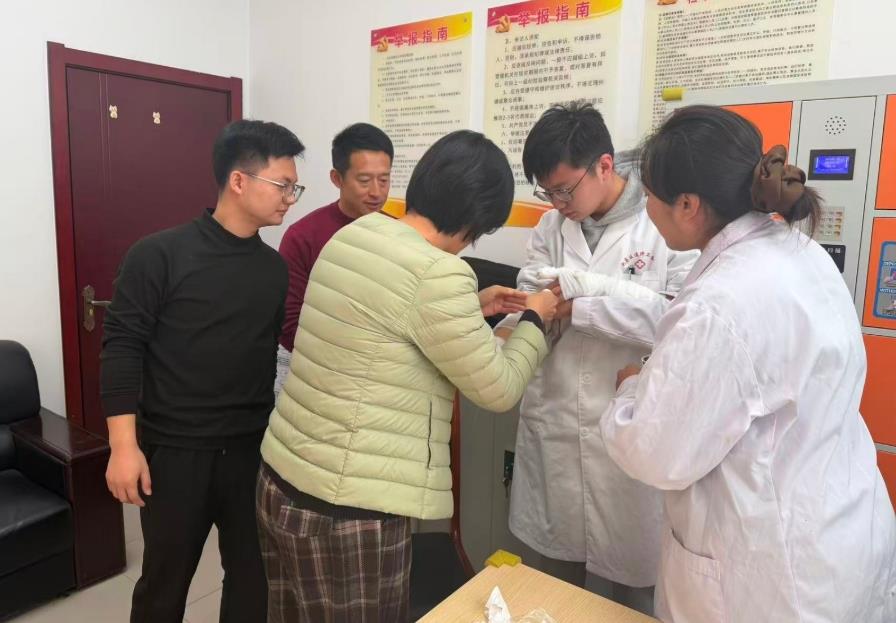 實(shí)操環(huán)節(jié)中,衛(wèi)生院醫(yī)護(hù)人員以模擬傷口為教具,手把手指導(dǎo)學(xué)員運(yùn)用紗布、繃帶進(jìn)行操作,及時(shí)糾正“包扎過(guò)緊影響血運(yùn)”“打結(jié)位置不當(dāng)”等問(wèn)題。紀(jì)工委工作人員分別演練、相互糾錯(cuò),現(xiàn)場(chǎng)互動(dòng)頻繁,迅速掌握了標(biāo)準(zhǔn)化操作要領(lǐng)。“以往遇到突發(fā)外傷常手足無(wú)措,現(xiàn)在學(xué)會(huì)了規(guī)范處置方法,履職更有底氣!奔o(jì)工委工作人員表示。
