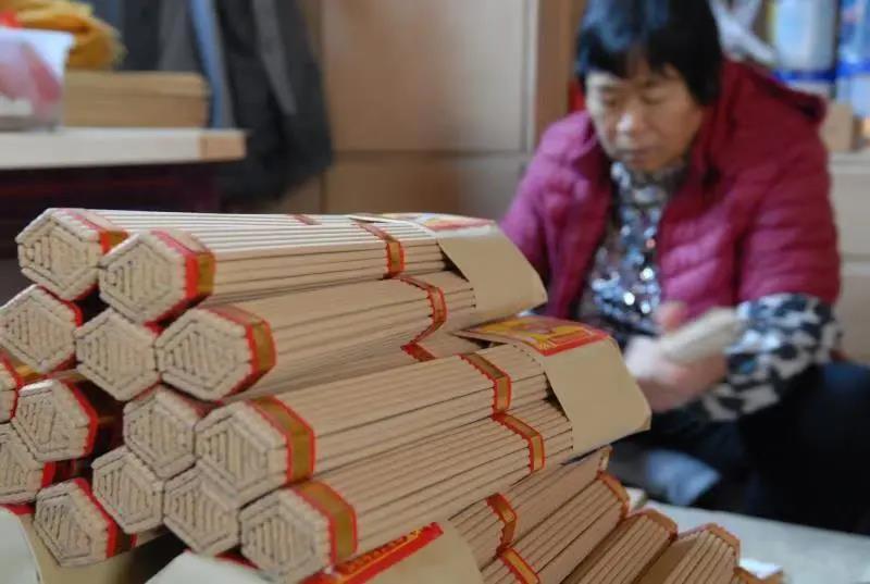 在村民于建波家中,幾名婦女在一間大屋里生起火爐,坐在馬扎上一邊聊著天一邊包裝著剛制作好的香,歡聲笑語中絲毫感覺到不到工廠內(nèi)的緊迫。于建波說,這里的工人都是村里的村民,每到年關(guān)她們都會來制香、包裝香,在家門口坐著馬扎就能賺到錢。“春節(jié)前是旺季 銷量比平日翻幾番。這不,就在剛才有個青島李村的客戶就拉走了兩大卡車的貨。還說透著過年前還要兩卡車(香)貨”于建波笑呵呵地說道。