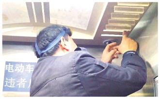 物業(yè)人員對(duì)電梯內(nèi)電動(dòng)車智能阻止系統(tǒng)進(jìn)行調(diào)試。