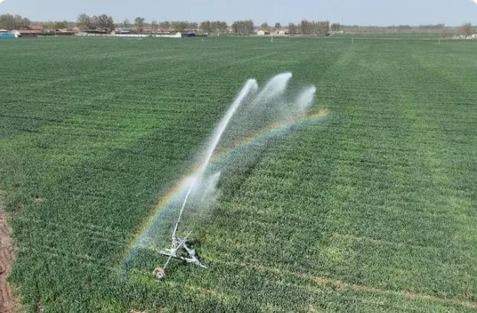 農(nóng)民利用自走式噴灌機在澆灌小麥。(來源:即墨區(qū)委宣傳部)