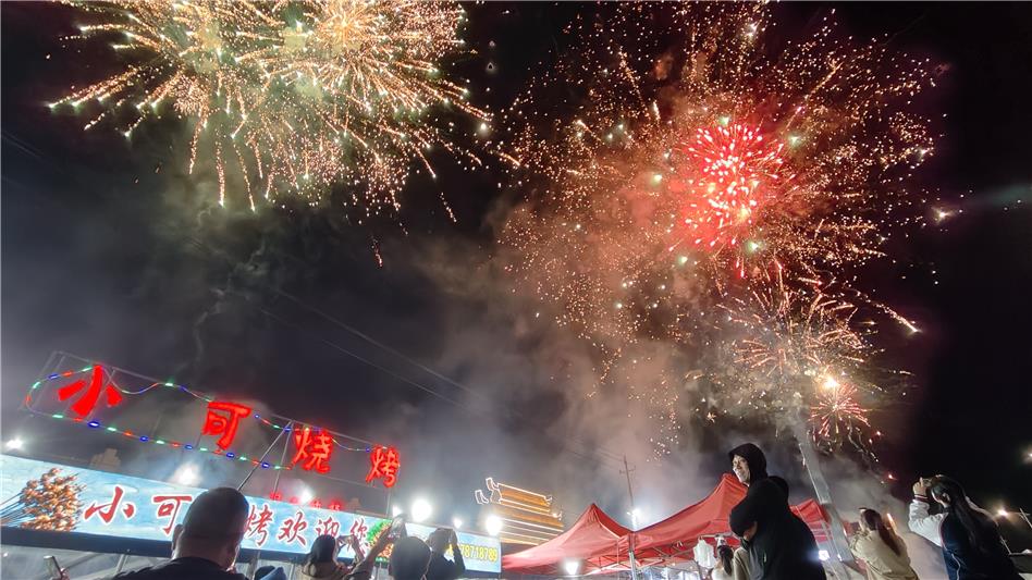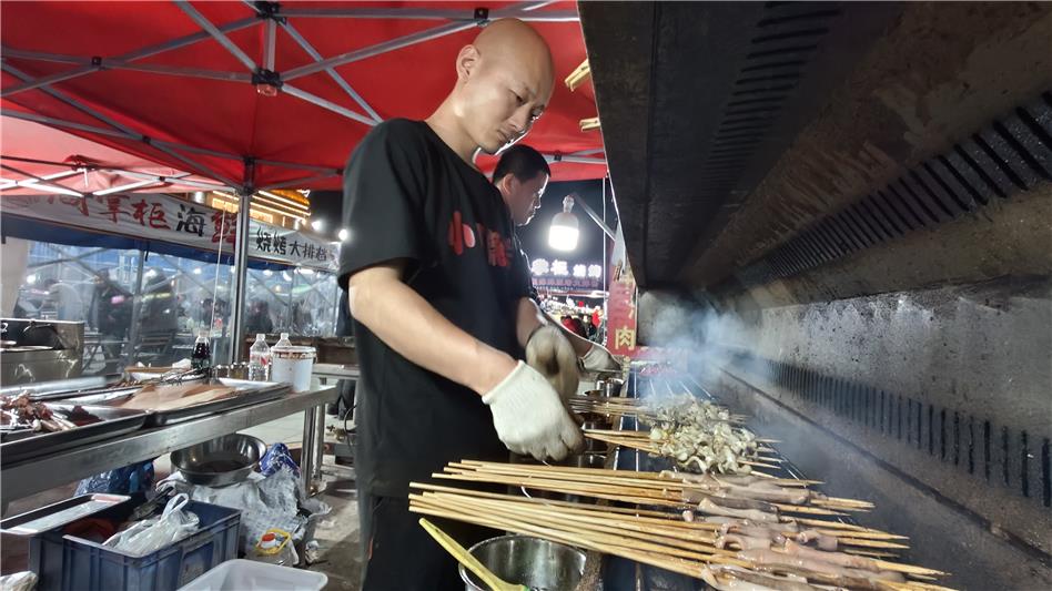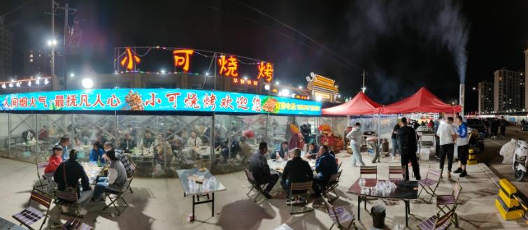 千米長(zhǎng)的燒烤街,家家座無虛席,門前還有不少顧客正排隊(duì)等座!昂芟矚g來這里,坐著馬扎,吃著烤肉非常接地氣!币晃活櫩驼f,氤氳的煙火氣讓他在大快朵頤同時(shí),感受到濃濃的氛圍感。