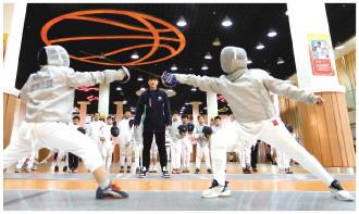 學(xué)生在大課間活動(dòng)中練習(xí)擊劍。