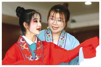專業(yè)老師指導(dǎo)學(xué)生學(xué)習(xí)京劇。