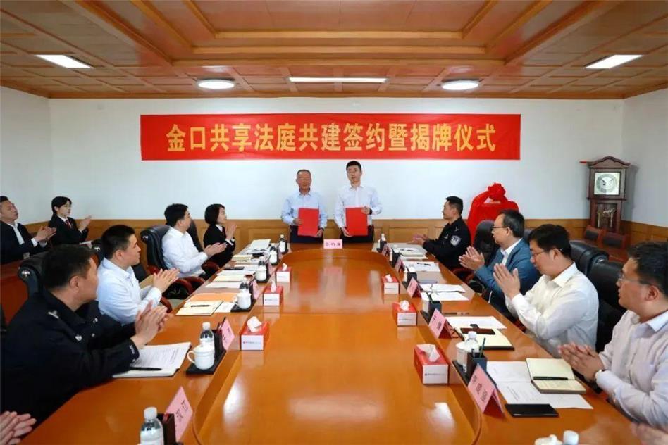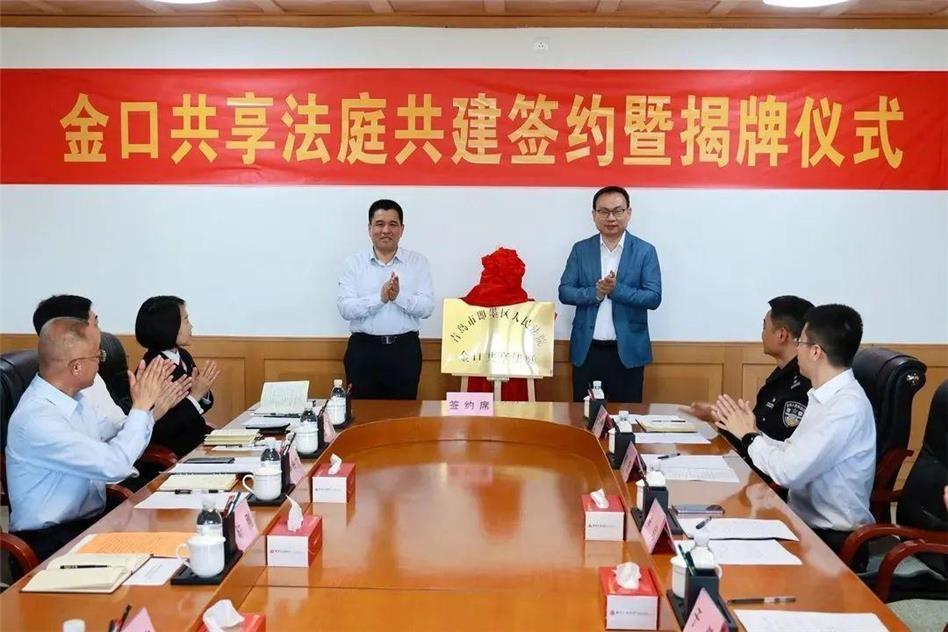 儀式上,即墨法院與金口鎮(zhèn)簽訂了共享法庭共建協(xié)議,陳剛、李釗共同為即墨法院金口共享法庭揭牌。在隨后召開的座談會上,鰲山法庭、店集派出所、金口派出所、金口司法所、神山埠村調(diào)解小組等依次發(fā)言,各方就共同推進共享法庭建設(shè)進行深入交流。