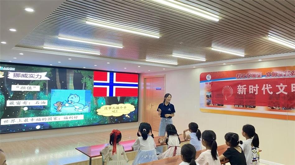 在課程中,劉老師首先通過提問的方式,吸引孩子們對(duì)故事內(nèi)容的興趣,接著詳細(xì)介紹了故事作者的生平、風(fēng)格及代表作,并對(duì)作者的家鄉(xiāng)挪威和故事的主角鴨子的相關(guān)信息進(jìn)行了拓展延伸,最后在老師的引領(lǐng)下,孩子們對(duì)故事內(nèi)容有了更深入的理解。