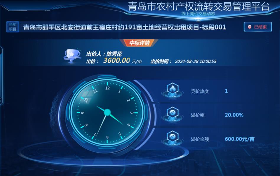此次交易的標(biāo)的地塊位于北安街道前王宿莊村,流轉(zhuǎn)面積191畝,經(jīng)村黨支部會(huì)提議、村“兩委”會(huì)商議、黨員大會(huì)審議、村民代表會(huì)議決議、街道批復(fù)后,相關(guān)工作人員將地塊發(fā)包信息發(fā)布于青島市農(nóng)村產(chǎn)權(quán)流轉(zhuǎn)交易平臺(tái),廣泛吸引潛在意向方。整個(gè)交易過程,意向方實(shí)現(xiàn)注冊(cè)報(bào)名、資格確認(rèn)、標(biāo)的競(jìng)價(jià)全流程線上辦理,“數(shù)據(jù)跑”代替“人員跑”,提高競(jìng)價(jià)效率及透明度,全程保障交易合法合規(guī)。