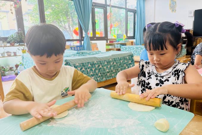 活動前,教師帶領幼兒了解了秋分的由來、習俗并提前準備了紅豆、面團、搟面杖等材料。活動中,小朋友們一起做豆包,取一團面團,在手心中揉成圓形,用搟面杖將面團搟制成圓餅,將豆沙餡放置在圓餅中央,將面團開口捏合,團成圓圓的豆包。隨后放入蒸箱里,蒸熟后,小朋友們共同品嘗自己的勞動成果