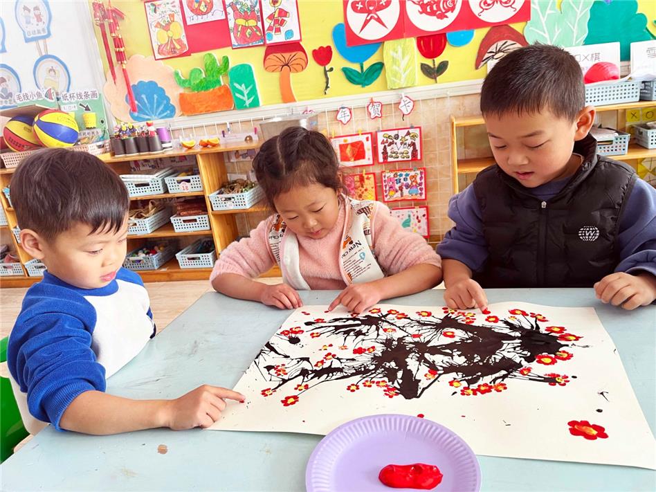 根據(jù)孩子們的年齡特點,金口中心幼兒園的老師們通過圖片、視頻、繪本故事等多種形式向孩子們展示小寒節(jié)氣的特征,帶領(lǐng)孩子們欣賞梅花圖片,感受梅花的色彩及形態(tài)美。隨后,孩子們在老師的指導(dǎo)下,將白紙平整的鋪在桌子上,每人拿一支吸管,他們用吸管蘸上墨水,用力地吹氣,墨汁就順著紙蔓延開來,綻放成形態(tài)各異的枝干,充滿了童趣。完成吹墨后,孩子們再用稚嫩的小手指蘸著紅色顏料,在紙上點綴出梅花花瓣,經(jīng)過孩子們的創(chuàng)作,一幅幅栩栩如生的梅花綻放圖展現(xiàn)在大家面前。