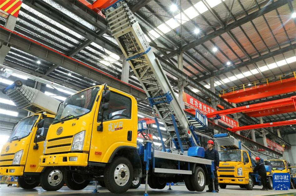 3月16日,在即墨區(qū)金口鎮(zhèn)的一家特種車生產(chǎn)企業(yè),員工在調(diào)試云梯車。