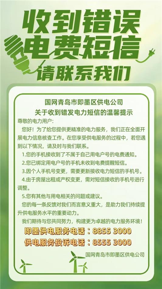 國網(wǎng)青島市即墨區(qū)供電公司關(guān)于收到錯誤電費短信的溫馨提示