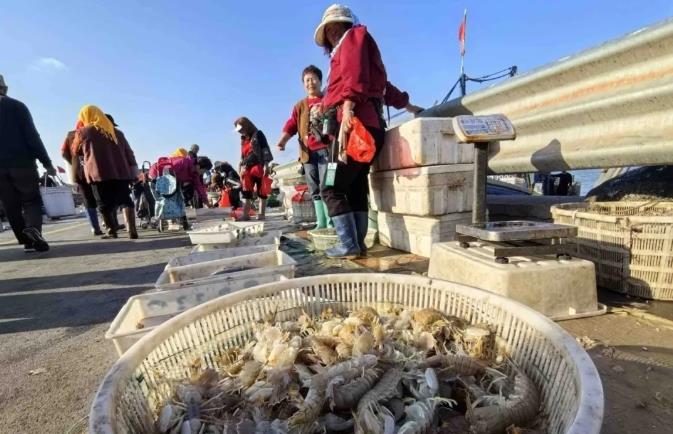 “快來看看。偵习兜乃笞有,35元一斤,保準(zhǔn)新鮮!睗O家大嫂王秀麗從船上接過一筐梭子蟹,麻利地放在攤位上,大聲吆喝起來。她的攤位前很快圍滿了人,有的市民已經(jīng)迫不及待地蹲下身,用手輕輕捏著蟹子的腹部,挑選著肥美的梭子蟹。